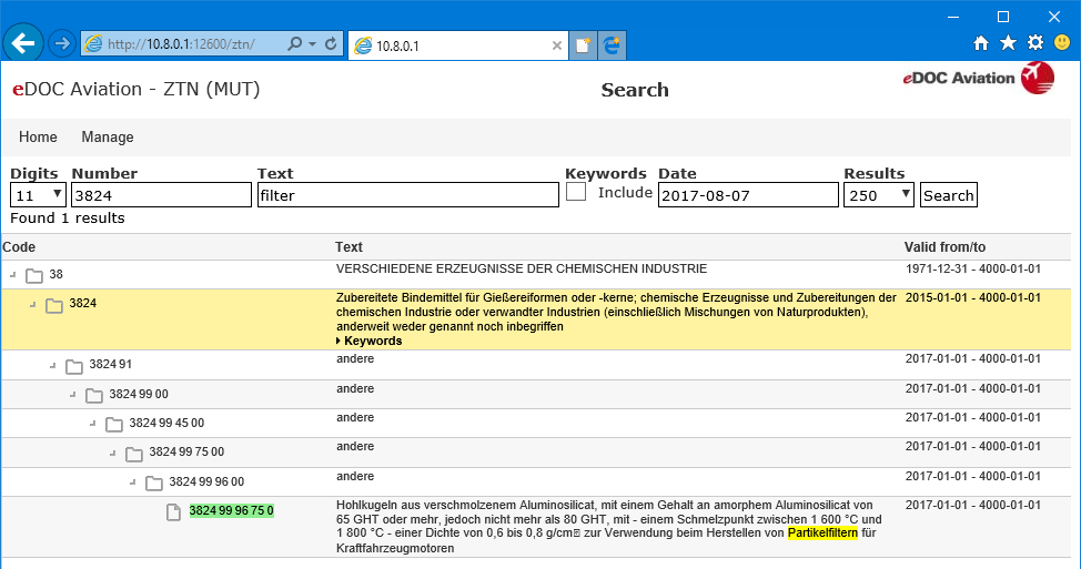 Um eine korrekte Tarifierung zu ermöglichen, ist es notwendig, die umfangreichen Basisdaten der Zolldirektion aufzubereiten, so dass sie komfortabel durchsucht und dargestellt werden können. Unser Softwarepaket ZTN bietet in der Basisversion dafür eine leistungsfähige Volltextsuche, die in Kombination mit einer Einschränkung der Nummernkreise die gesuchte Information schnell und übersichtlich präsentiert.