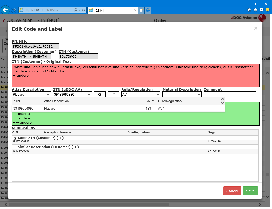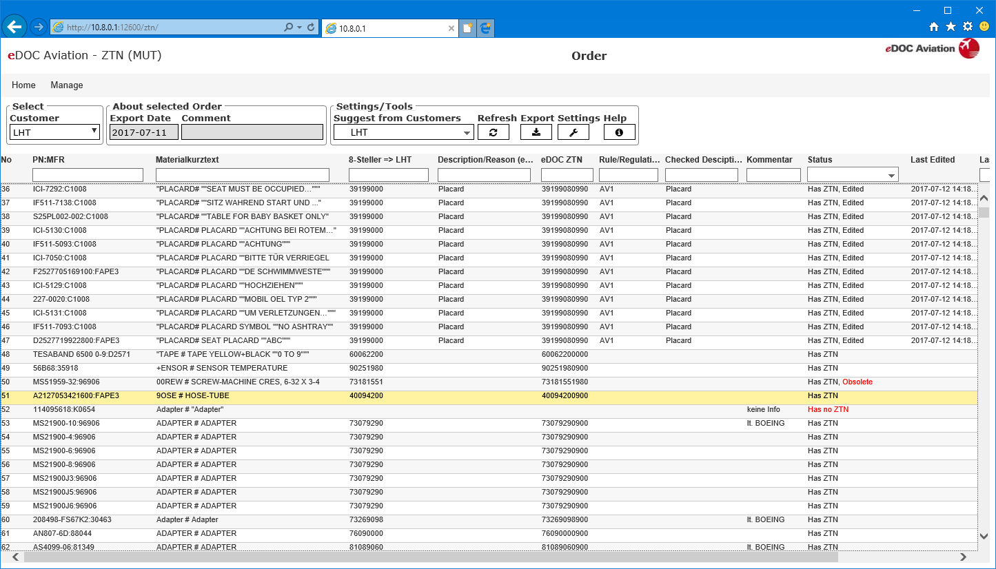 Das Tarifieren von Material Stammdaten erfordert nicht nur eine komfortable und leistungsfähige Software, sondern auch sehr viel spezielles Know-How. Unser Service-Partner eDOC Aviation Service bietet verschiedene Dienstleistungen rund um das Thema Zoll&Export und verlässt sich dabei auch auf unser Softwarepaket ZTN.