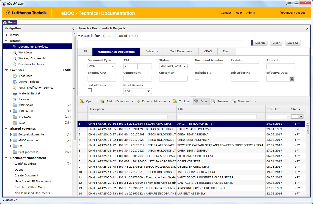 Durch den Einsatz der eDOC Suite, die wir seit 2002 für unseren Kunden Lufthansa Technik entwickeln und pflegen, wird der gesamte Dokumentationsprozess digital abgebildet und der Arbeitsaufwand stark reduziert. Die Softwarelösung ist webbasiert und verwendet neueste Technologien.